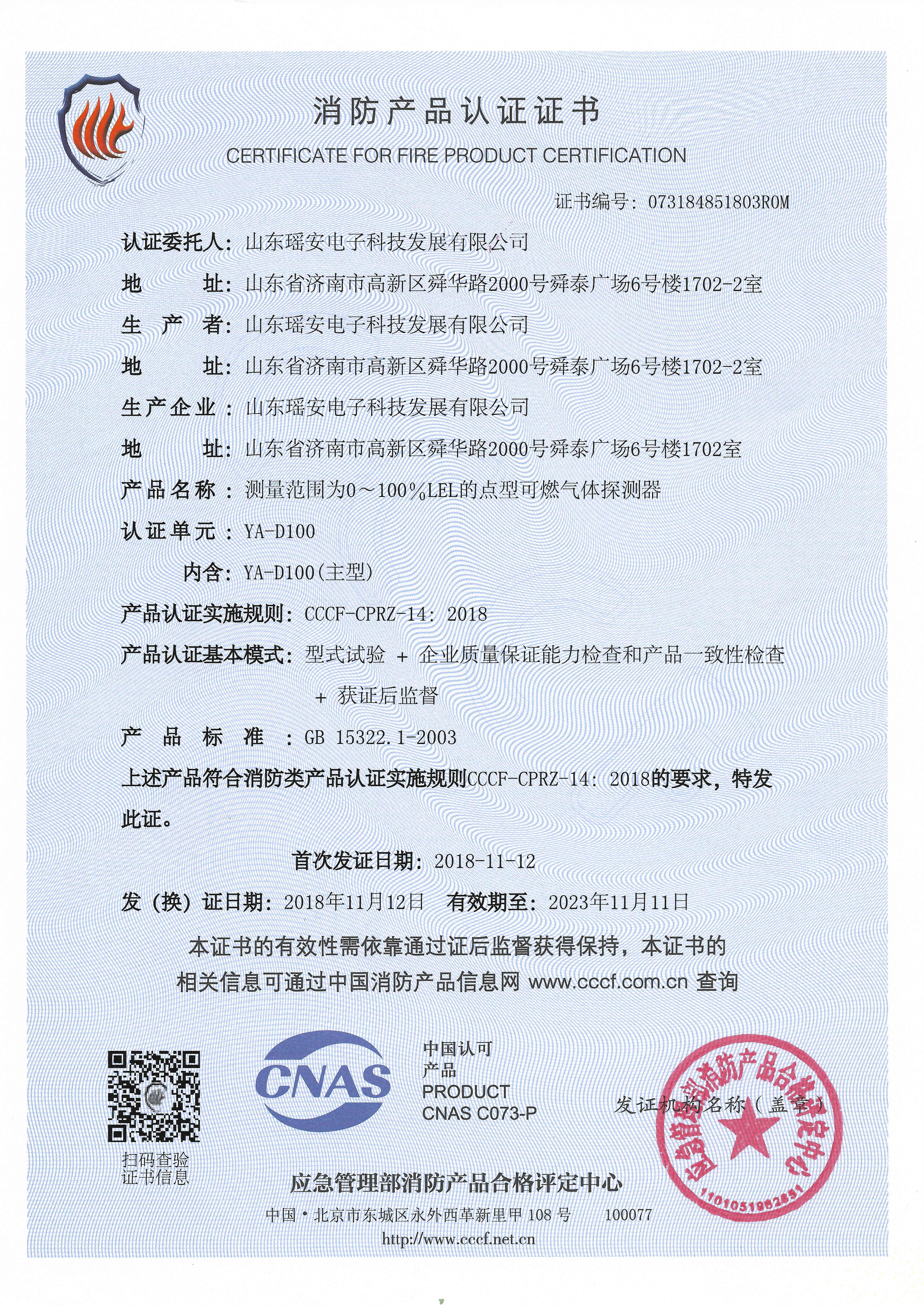 YA-D400消防強(qiáng)制性產(chǎn)品認(rèn)證證書(shū)