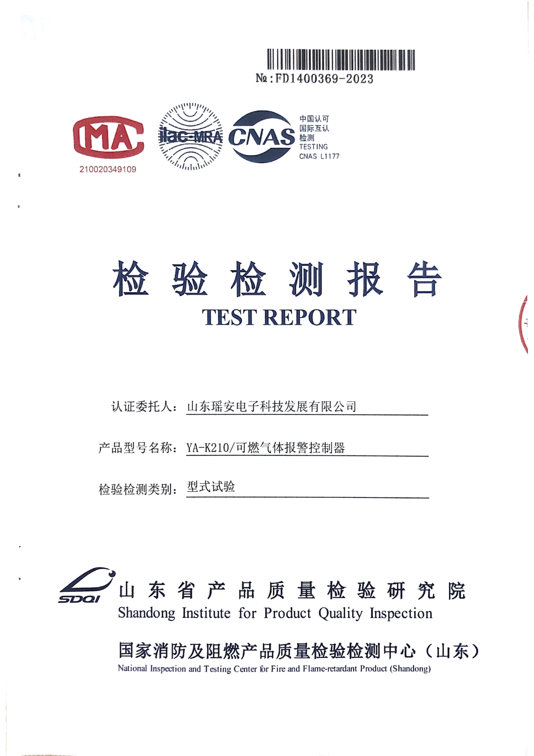 瑤安氣體報(bào)警控制器YA-K210總線消防檢驗(yàn)報(bào)告