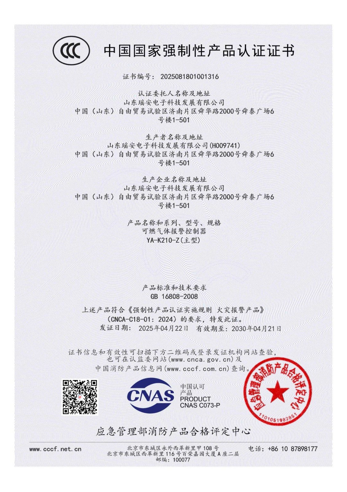 YA-K210消防強(qiáng)制性產(chǎn)品認(rèn)證證書(shū)