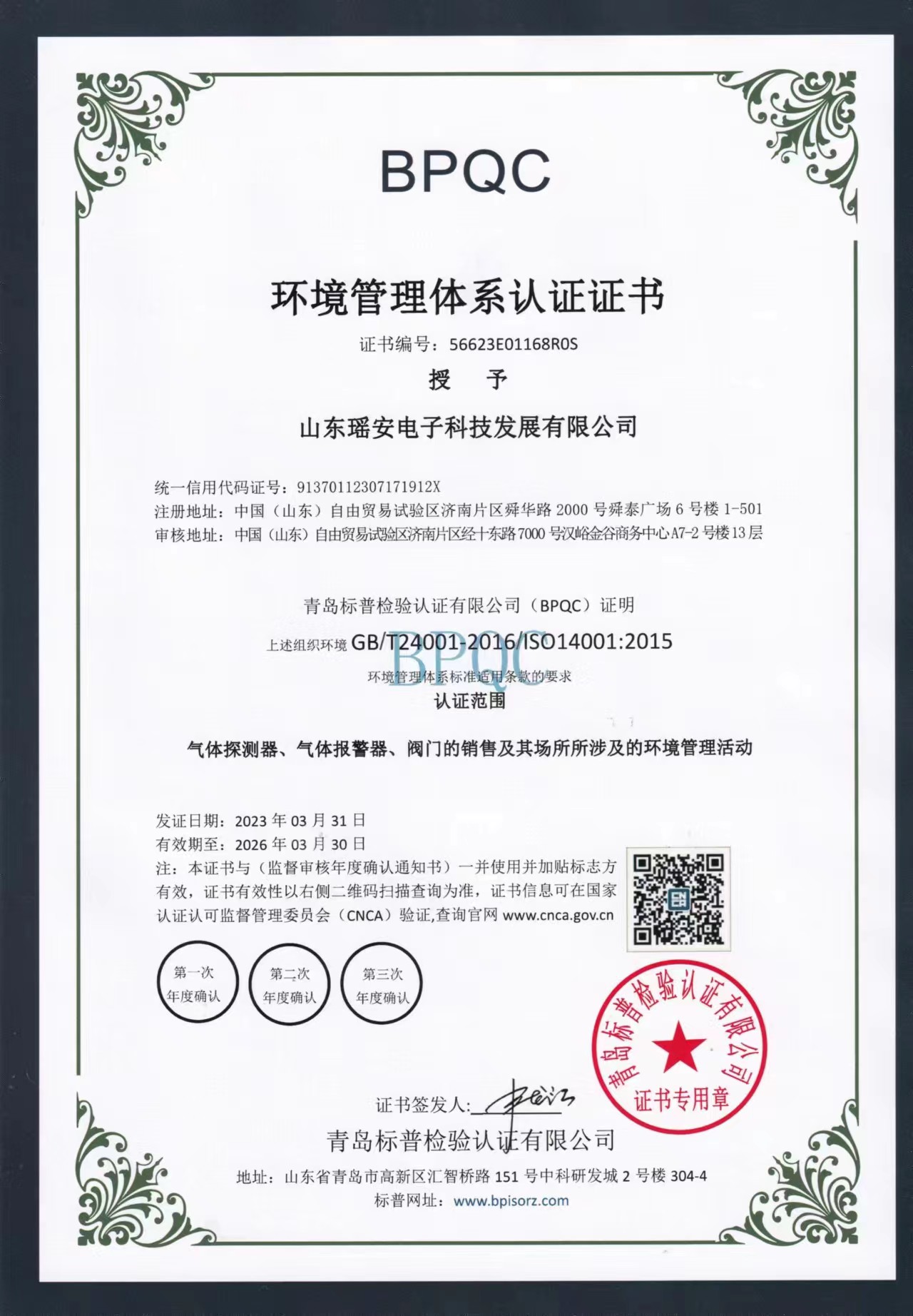 環(huán)境管理體系認(rèn)證證書