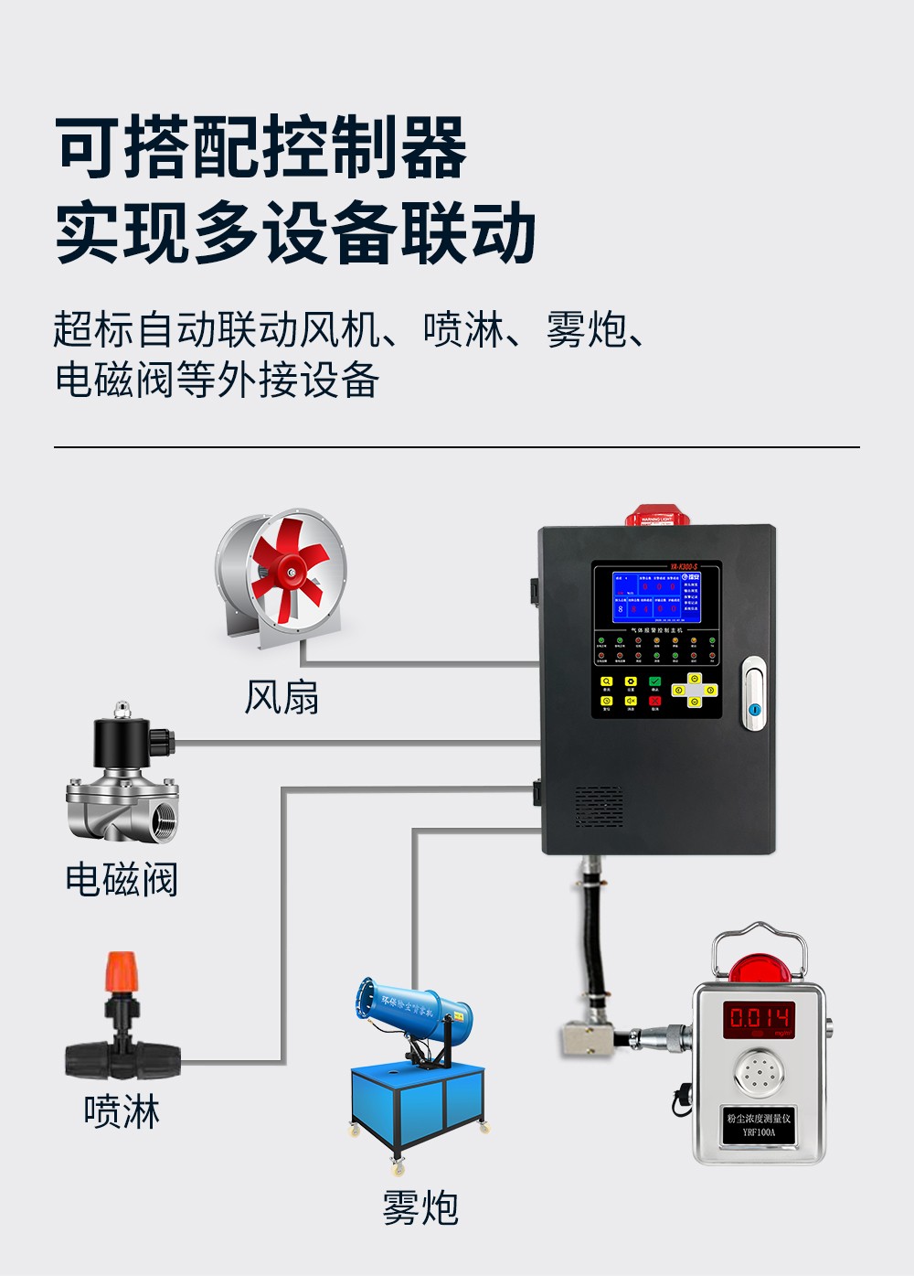 9、超標(biāo)聯(lián)動(dòng):多設(shè)備聯(lián)動(dòng),超標(biāo)自動(dòng)開(kāi)啟風(fēng)機(jī)、噴淋、霧炮等外接設(shè)備降塵除塵