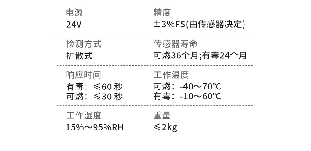 工作溫、濕度 | 可燃:-40~70℃,15%~95%RH; 有毒:-10~60℃;15%~95%RH |