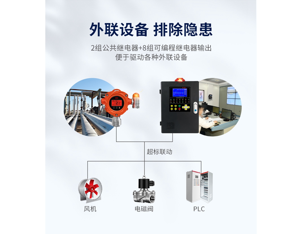 9、輸出接口多樣化:內(nèi)置10組繼電器(2組公共繼電器+8組可編程繼電器),接口拓展豐富,能以有源和無源方式驅(qū)動(dòng)排風(fēng)扇、電磁閥等設(shè)備,適應(yīng)不同現(xiàn)場(chǎng)情況