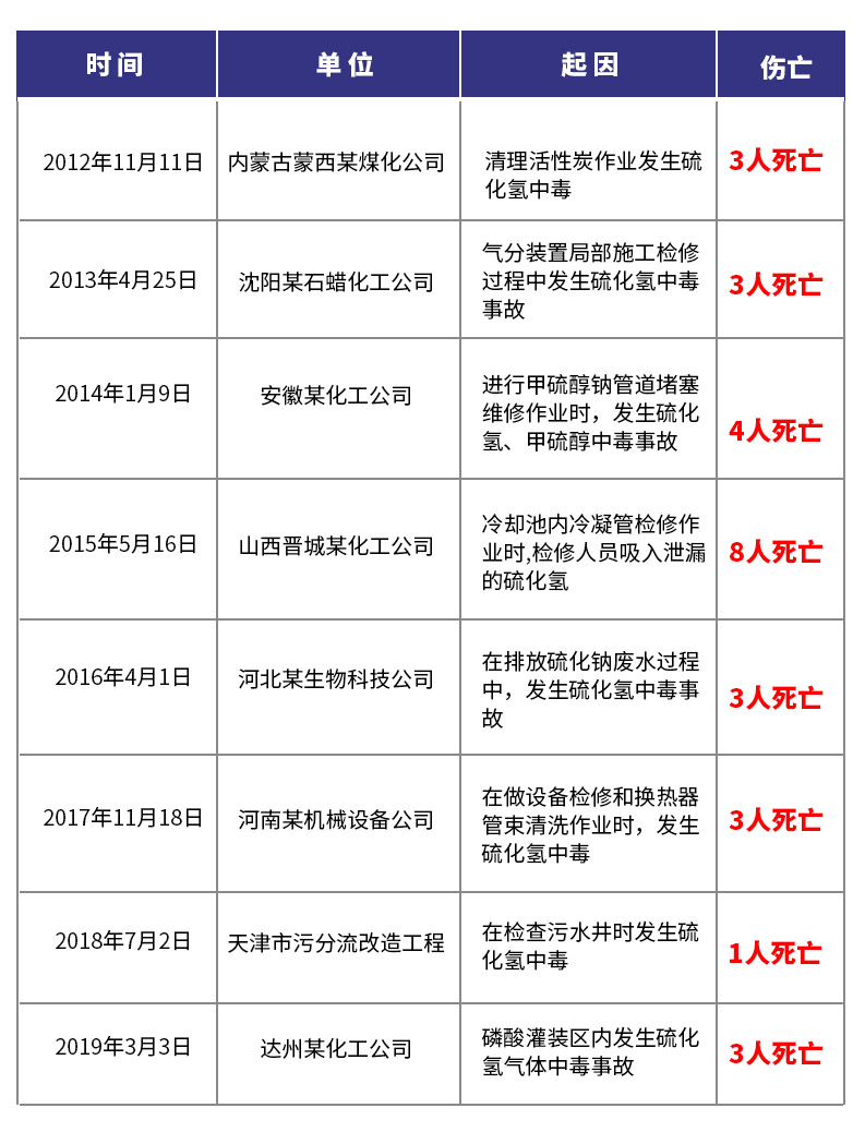 2012年-2019年因硫化氫氣體中毒,導(dǎo)致的較大事故屢見(jiàn)不鮮,血的教訓(xùn)再次敲響安全生產(chǎn)的警鐘!